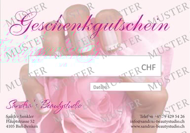 aus Sandra's Beautystudio. Der Wert des Gutscheins kann ganz individuell festgelegt werden.